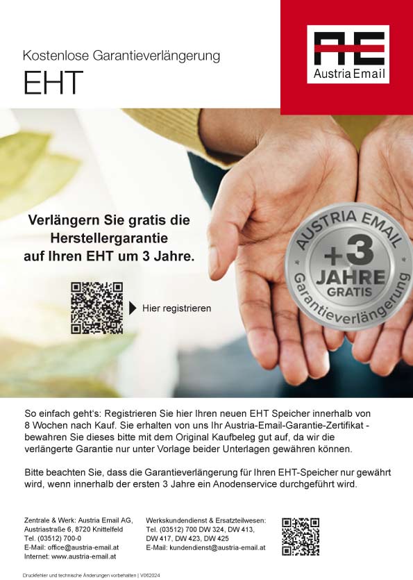 Austria Email Elektro Boiler EKH-S 100, 100 Liter neues Design Diese Punkte und mehr sprechen dafür! Wesentlich verlängerte Service-Intervalle Es reicht nun die Anode alle 5 Jahre zu wechseln (bisher 2 Jahre lt. Norm). 10 Jahre Garantie- unter Einhaltung der Garantiebedingungen- (Schutzanode gegen Korrosion muß spätestens alle 5 Jahre durch Fachbetrieb nachweislich getauscht werden) auf den Innenkessel. Austria Email-Erfahrung und neue Technik. Die druckfesten Komfortspeicher sind platzsparende Geräte mit einem optimalen Preis-Leistungs-Verhältnis. neues zeitgemäßtes Design unveränderte Aufhängungsmaße und Wandabstand, d.h. der Austausch von bestehenden Austria Email Boilern ist gewährleistet. HFO Schaumisolierung ermöglicht kompakte und leichtere Bauweise bei besten Energiewerten hochwertiges Zeigerthermometer an der Vorderseite Betriebskontrollleuchte Deckel mit Serviceklappe für besseren Zugang zum Heizelement Weitere Daten: Stahlblechkessel emailliert nach DIN 4753 T3 mit Schutzanode sowie isoliert eingebauten Heizkörpern mit Schutzstromableitwiderstand für optimalen Korrosionsschutz. Betriebsdruck max. 6 bar Einbrennlackierter, weiß pulverbeschichteter Stahlblechaußenmantel Universell umklemmbare Ausführung für alle von den österreichischen EVU geforderten Aufheizzeiten, Leistungen und Anschlussspannungen Verstellbare Aufhängung für problemlosen Austausch eines Altgerätes sowie auf geänderte Inhaltsgrößen und Montagesituationen Bedienung über Paneel an der Vorderseite mit Drehknopf und allpoligem Sicherheitstemperaturbegrenzer n Energiesparstellung bei ca. 65°C und Frostschutzstellung Temperatur-Einstellbereichseinengung für kindersicheren Betrieb